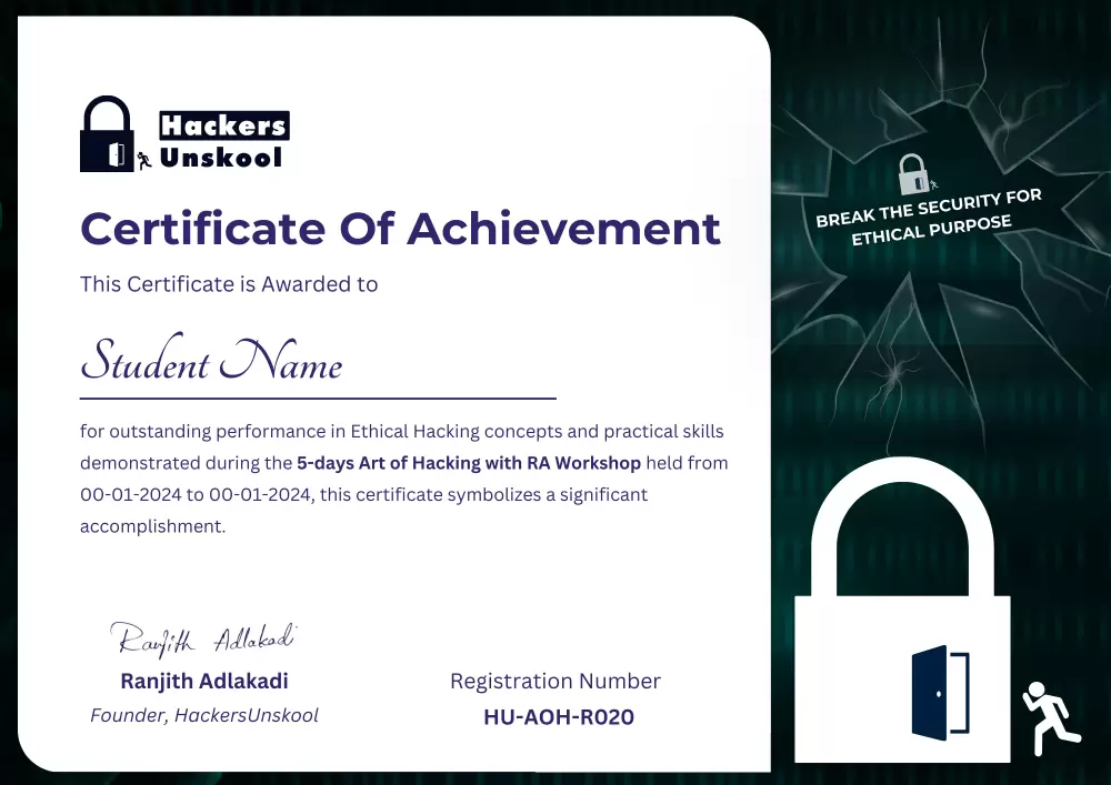 Posted on kalyan jkpTrustindex verifies that the original source of the review is Google. The 5-Day Art of Hacking with RA was awesome — I especially loved the cryptography sessions which gave me a new way to think about security. The trainers explained tough ideas clearly and the whole course is very affordable. Highly recommend for beginners!Posted on nagaraju kazaTrustindex verifies that the original source of the review is Google. Hai friends .. 5 days workshop start avaka mundu naku doubt undedi , classes ela cheptaro ani , but day1 ranjith sir class end ayelopu naku confidence vachindi , About the subject ; Sir explanation, Sir patience about clarifications , Step by Step procedures ,, So evaraina new members join avali anukunte doubt vaddu ,, happy ga join avvandi manchi knowledge gain chestaru ... so sir cheppe procedure nachi PRO courses ki kuda payment chesanu ,, Thank you ranjith sir .. For giving us a lot of knowledge ..Posted on Mahalaxmi KanisettiTrustindex verifies that the original source of the review is Google. The 5-day Art of Hacking workshop delivers an outstanding learning experience, blending live and recorded sessions for maximum flexibility and understanding. The teaching is beginner-friendly, practical, and deeply engaging, making ethical hacking concepts easy to grasp for everyone. Participants gain real-world skills with step-by-step guidance from expert mentors, benefiting from valuable community support as well. This program is truly a must-join for anyone serious about cybersecurity and ethical hackingPosted on santhosh kumarTrustindex verifies that the original source of the review is Google. I attended the session yesterday and found it very informative and engaging. The topic on hacking was explained in a clear and practical way, which helped me understand the concepts better. The session gave me useful insights into cybersecurity and how hacking techniques work, along with ways to prevent them. Overall, it was a great learning experience, and I appreciate the effort put into making it interesting and interactive.Posted on J PremchandTrustindex verifies that the original source of the review is Google. From the start of the workshop ,I'm very excited to learn new things about cybersecurity.I really inspired by seeing Ranjith anna,He has so patient and sacrifice his sleep for us for clearing doubts in our mind,when I was to start workshop, I'm a begginer in workshop,I don't about anytype of malware and Ransomeware and darkweb,but attending this workshop I had learnt many new things,the way anna explains very excellent and impressive, I'm very proud to say that my mentor is Ranjith anna,Not only the theory anna provided practical experience regarding hacking for everyone,he provided tools and softwares that helps us to dive deeply, Finally I Strongly Recommend HackerUnskool with Ranjith anna...Thanks for Sharing Your Knowledge..always shine as SunPosted on Mahesh kumarTrustindex verifies that the original source of the review is Google. Great course — practical, well-structured and hands-on. Mr Ranjith explained concepts clearly and provided useful real-world exercises. Highly recommended for anyone wanting to learn ethical hacking.Posted on Tadipathri RiyazTrustindex verifies that the original source of the review is Google. Starting I'm thinking...this work shop only deals with theoretically...meanwhile I'm realize..this workshop teach me more knowledge with practically with alot of fun and excitementPosted on Chenna Keshavulu PTrustindex verifies that the original source of the review is Google. I am Chenna Keshavulu and I have zero knowledge about hacking before 5 days workshop but now I knew little bit about hacking. In this 5 days workshop I learned what is hacking and how hackers are hack the systems, mobile phones and websites then how they stole the data by creating links. I learned about LAN and WAN hacking techniques. Thank you Ranjith bro for giving such wonderful knowledge about hacking. Hackersunskool is the best platform for learning hacking. Thank you.Posted on Bhaskar RaoTrustindex verifies that the original source of the review is Google. ExcellentPosted on RaniTrustindex verifies that the original source of the review is Google. Great session — your explanations made complex attacks easy to follow. Clear, practical, and exactly what I needed. Thank you Excellent hands-on examples — I could apply them immediately You explain tricky concepts calmly and step-by-step. Much appreciated Loved the labs — challenging but achievable.Load more